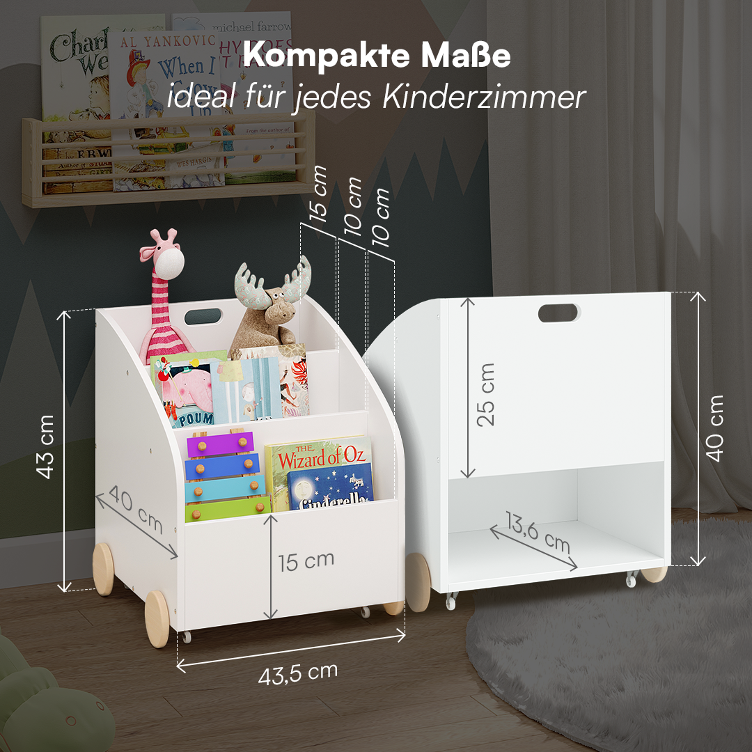 Mit kompakten Maßen von 43 x 40 x 43 cm passt das Regal problemlos in jedes Kinderzimmer und schafft einen eigenen Bereich, in dem Kinder ihre Bücher und Spielsachen ordentlich aufbewahren können. Dank der Rollen ist das Regal flexibel positionierbar und kann leicht den individuellen Anforderungen angepasst werden.