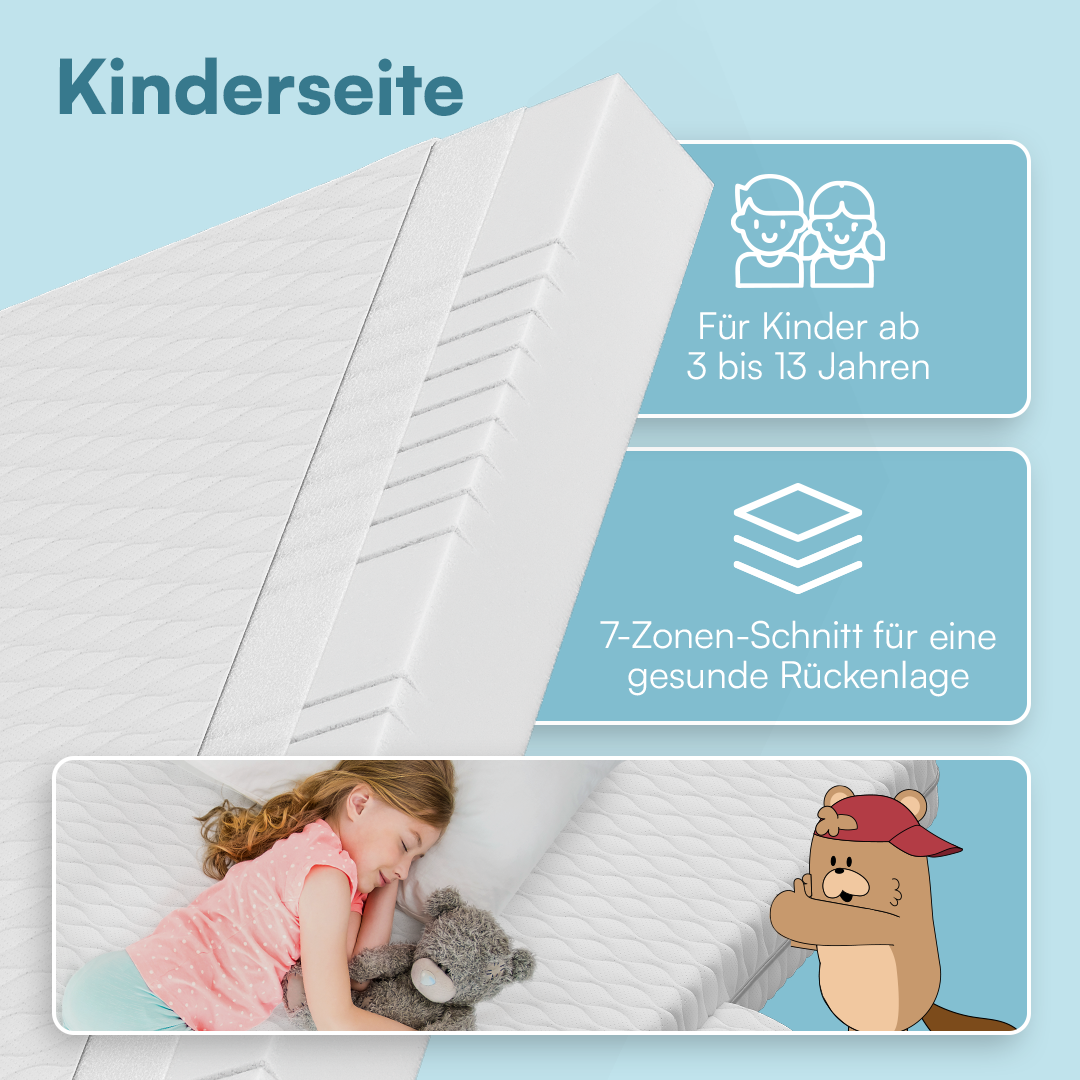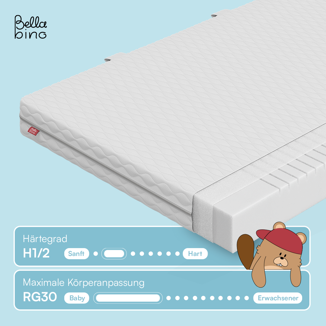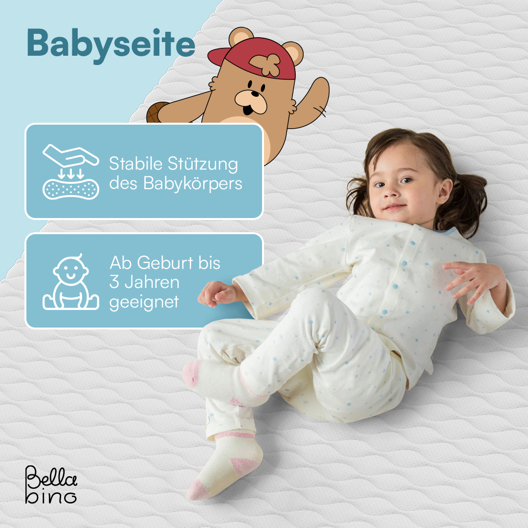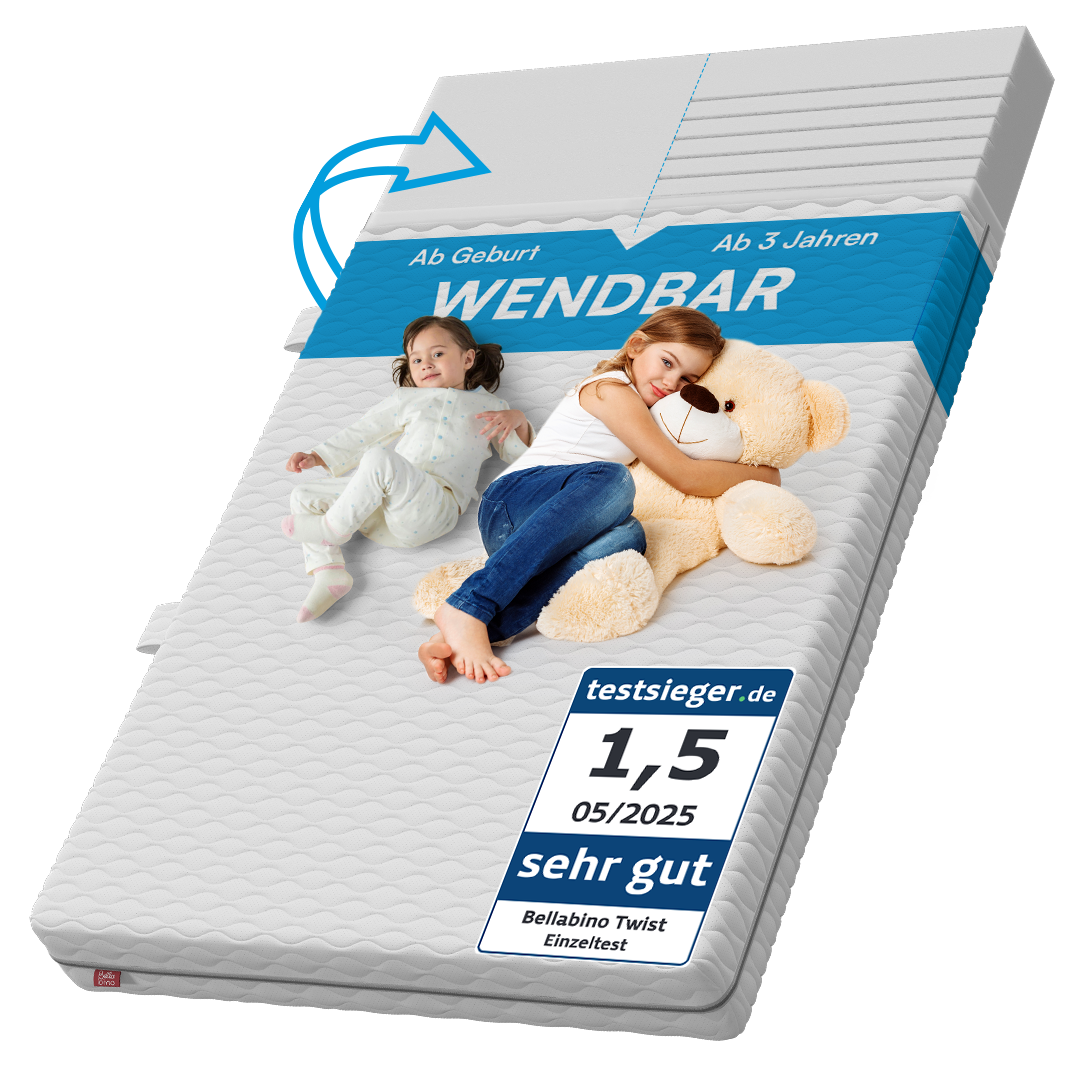 Die Bellabino Kindermatratze 'Twist' (90x200 cm) bietet Babys, Kleinkindern und Jugendlichen idealen Schlafkomfort und Sicherheit. Mit zwei wendbaren Härtegraden (H1/H2) begleitet sie Kinder von 1,5 bis 13 Jahren und unterstützt deren Entwicklung optimal. Die Babyseite ist glatt und fest, ideal für die Kleinsten, während die Kinderseite mit einem 7-Zonen-Schnitt die Wirbelsäule ergonomisch bis ins Jugendalter stützt. Der Bezug ist allergikerfreundlich, atmungsaktiv und bei 60 °C waschbar – ideal für ein frisches, hygienisches Schlafumfeld. Eine langlebige Wahl für Eltern, die höchste Qualitätsansprüche an die Schlafqualität ihrer Kinder stellen.