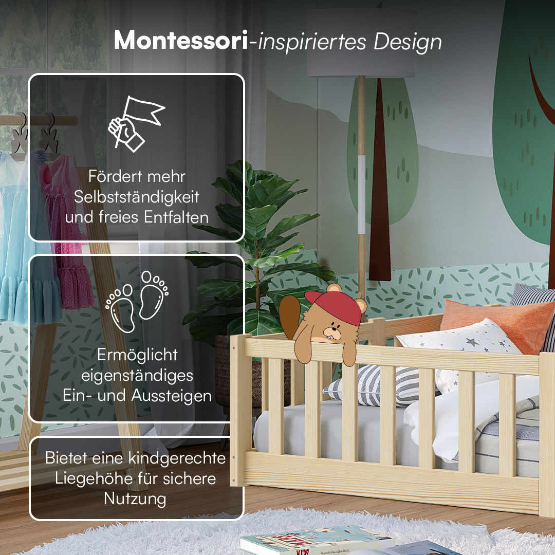Das Bodenbett Vere von Bellabino ist ideal für Kleinkinder, die ihr Bett selbstständig nutzen möchten. Nach Montessori-Prinzipien gestaltet, ermöglicht es durch die bodennahe Konstruktion einen sicheren und einfachen Zugang – ganz ohne Hilfe.