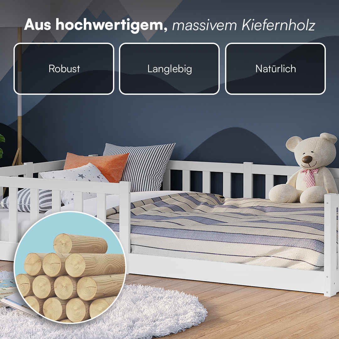 Das skandinavische Design des Bettes überzeugt durch seine zeitlose Eleganz und minimalistische Ästhetik, die jedes Kinderzimmer bereichert. Der integrierte Rausfallschutz sorgt für Sicherheit während des Schlafs, während der Zugang zur Liegefläche an der Vorderseite das Ein- und Aussteigen erleichtert. Mit einer maximalen Belastbarkeit von 100 kg können auch Eltern bequem neben ihrem Kind liegen und eine Gute-Nacht-Geschichte vorlesen.