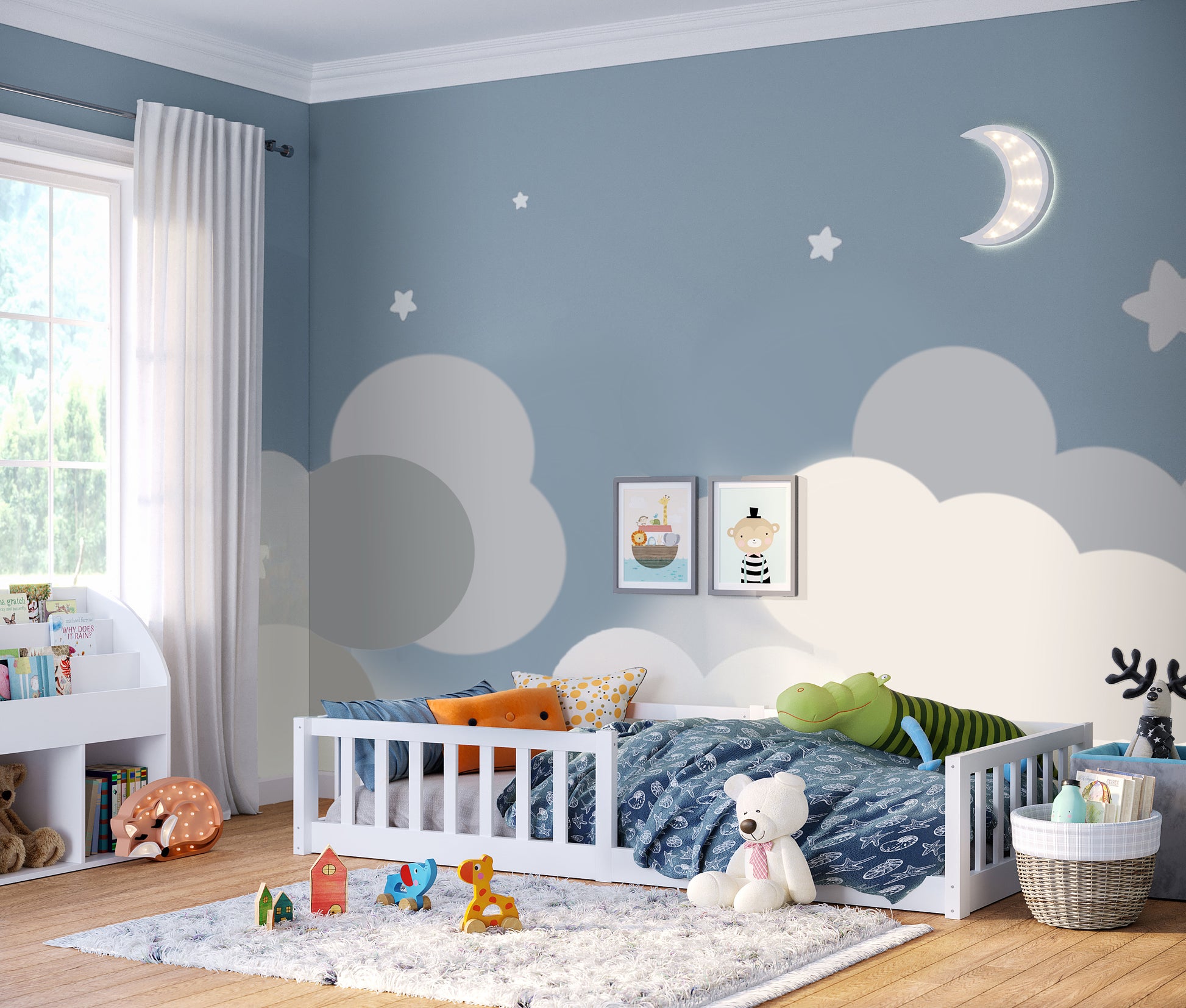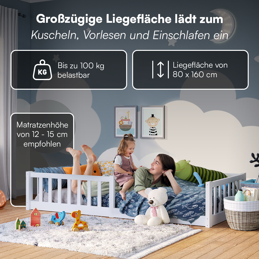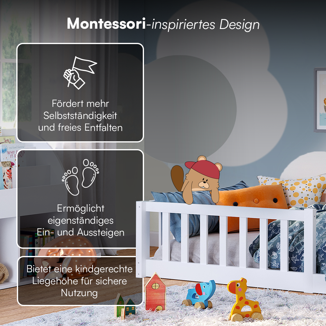 Das skandinavische Design des Bettes überzeugt durch seine zeitlose Eleganz und minimalistische Ästhetik, die jedes Kinderzimmer bereichert. Der integrierte Rausfallschutz sorgt für Sicherheit während des Schlafs, während der Zugang zur Liegefläche an der Vorderseite das Ein- und Aussteigen erleichtert. Mit einer maximalen Belastbarkeit von 100 kg können auch Eltern bequem neben ihrem Kind liegen und eine Gute-Nacht-Geschichte vorlesen.