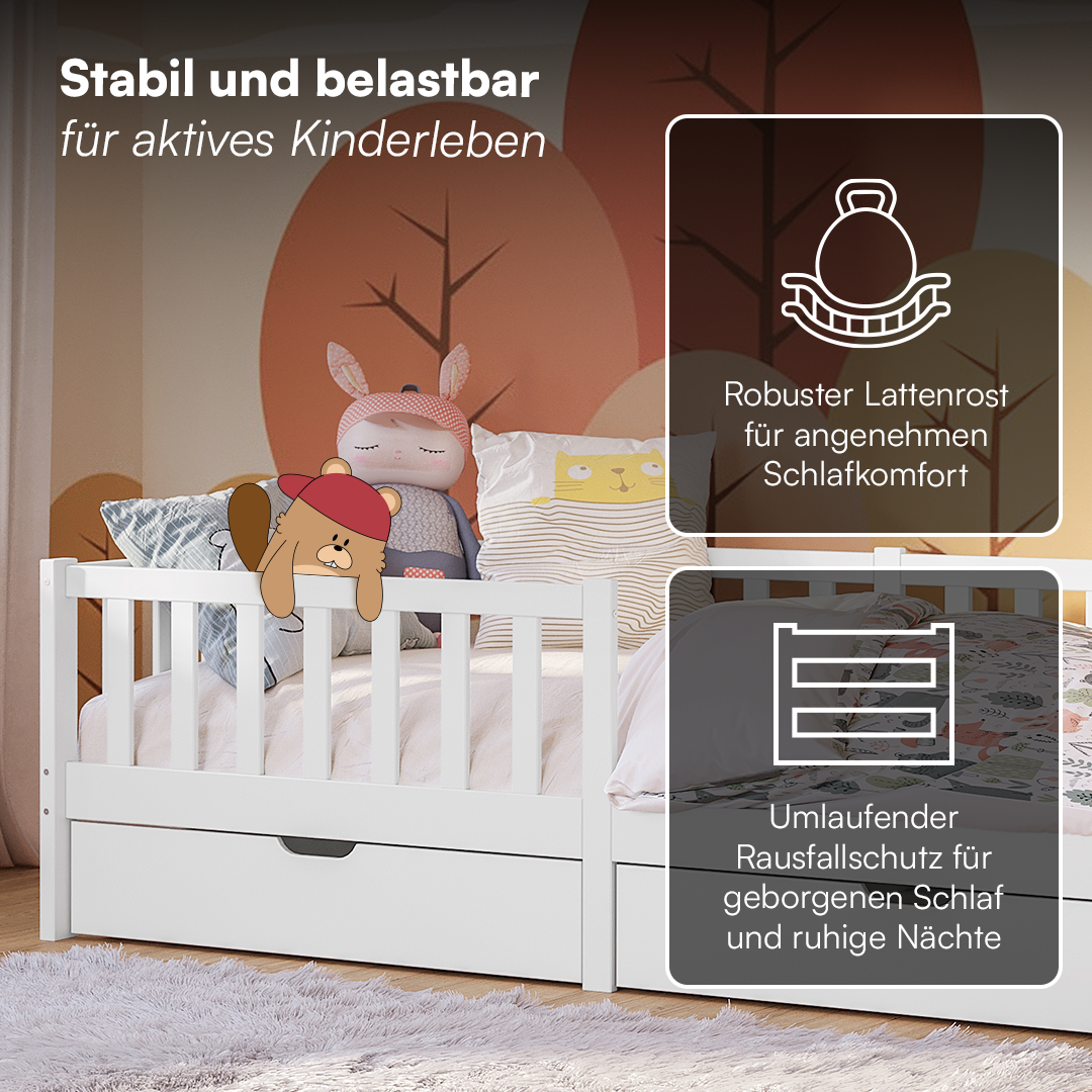 Das schlichte, weiße Kinderbett ‚Vere‘ passt in jedes Kinderzimmer, ob modern oder klassisch. Mit einer Liegefläche von 90x200 cm, umlaufendem Rausfallschutz und passendem Lattenrost bietet es Sicherheit und lässt sich schnell aufbauen. Zwei leichtgängige Schubladen unter dem Bett schaffen praktischen Stauraum für Spielzeug oder Bettwäsche. Gefertigt aus robustem, pflegeleichtem Material, ist es bis 100 kg belastbar und bleibt lange schön. Ob zum Schlafen, Spielen oder Träumen – ‚Vere‘ begleitet Kinder viele Jahre zuverlässig.