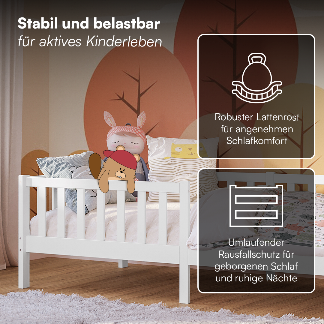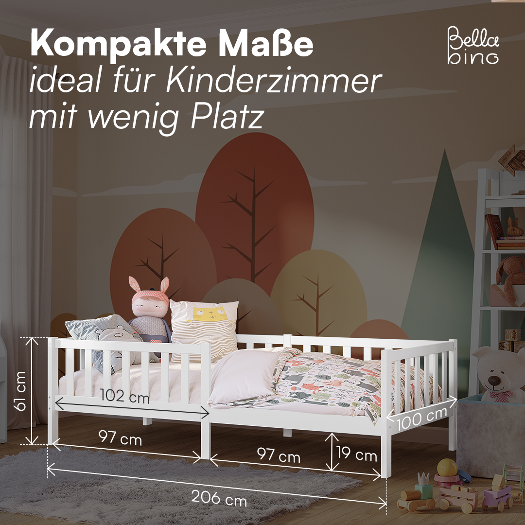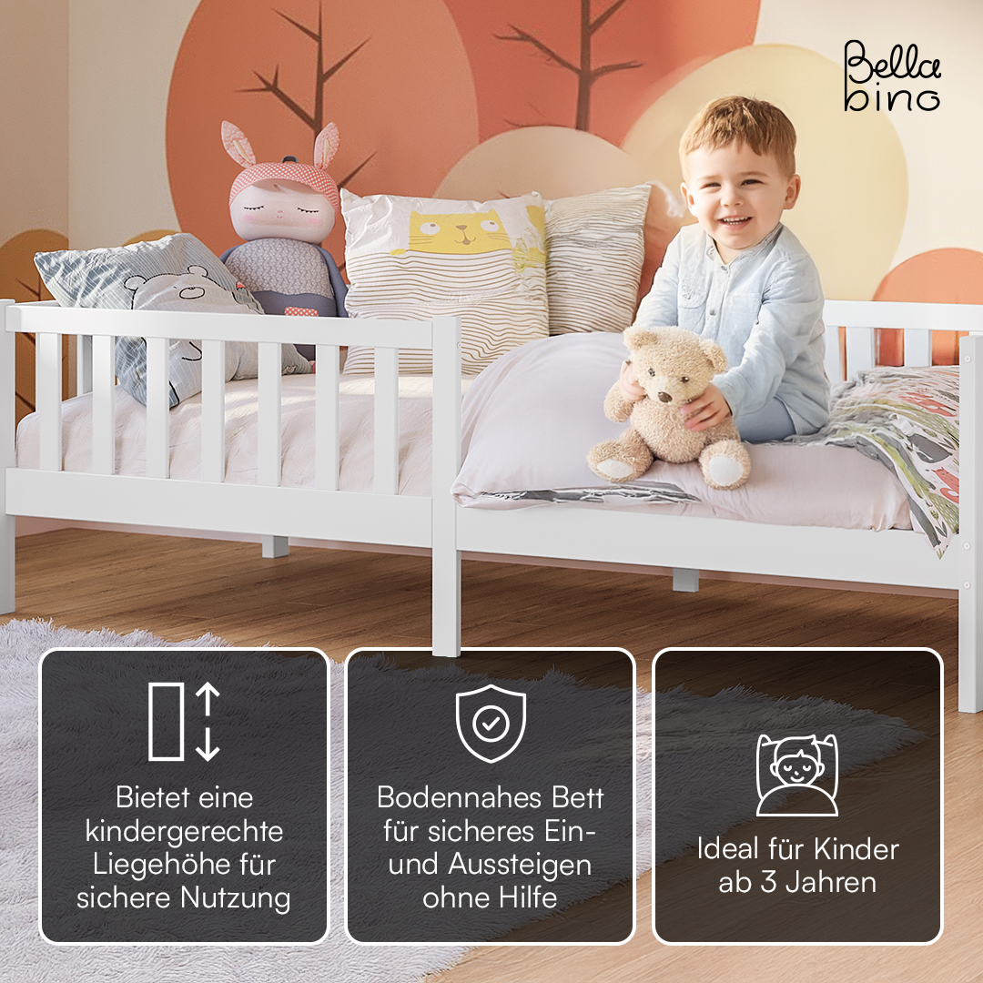 Das Kinderbett ‚Vere‘ von Bellabino ist ideal für kleine Schlafanfänger, die ihr erstes eigenes Bett beziehen. Mit seinem zeitlosen, weißen Design passt es in jedes Kinderzimmer, ob modern, verspielt oder klassisch. Die Liegefläche von 90x200 cm bietet viel Platz zum Schlafen, Kuscheln oder Lesen; ein passender Lattenrost ist bereits dabei. Der umlaufende Rausfallschutz gibt Sicherheit und Geborgenheit – perfekt für den Übergang vom Gitterbett. Aus hochwertigen Materialien gefertigt, stabil und bis 100 kg belastbar, bleibt ‚Vere‘ lange schön und hält auch wildem Toben stand. Ob als erstes eigenes Bett oder platzsparende Lösung: ‚Vere‘ begleitet Kinder zuverlässig durch viele Jahre.