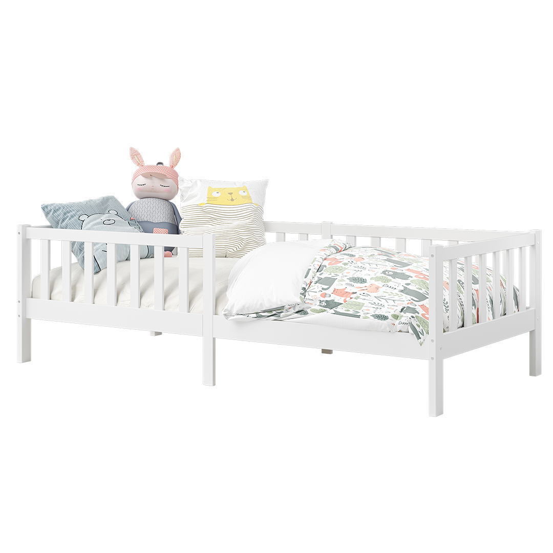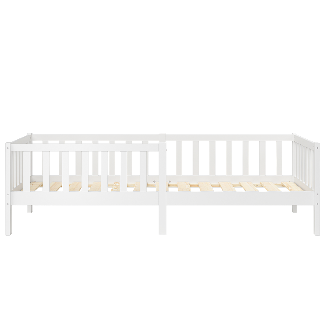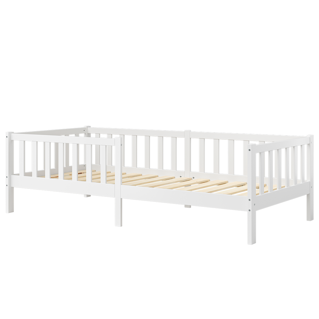 Das Kinderbett ‚Vere‘ von Bellabino ist ideal für kleine Schlafanfänger, die ihr erstes eigenes Bett beziehen. Mit seinem zeitlosen, weißen Design passt es in jedes Kinderzimmer, ob modern, verspielt oder klassisch. Die Liegefläche von 90x200 cm bietet viel Platz zum Schlafen, Kuscheln oder Lesen; ein passender Lattenrost ist bereits dabei. Der umlaufende Rausfallschutz gibt Sicherheit und Geborgenheit – perfekt für den Übergang vom Gitterbett. Aus hochwertigen Materialien gefertigt, stabil und bis 100 kg belastbar, bleibt ‚Vere‘ lange schön und hält auch wildem Toben stand. Ob als erstes eigenes Bett oder platzsparende Lösung: ‚Vere‘ begleitet Kinder zuverlässig durch viele Jahre.