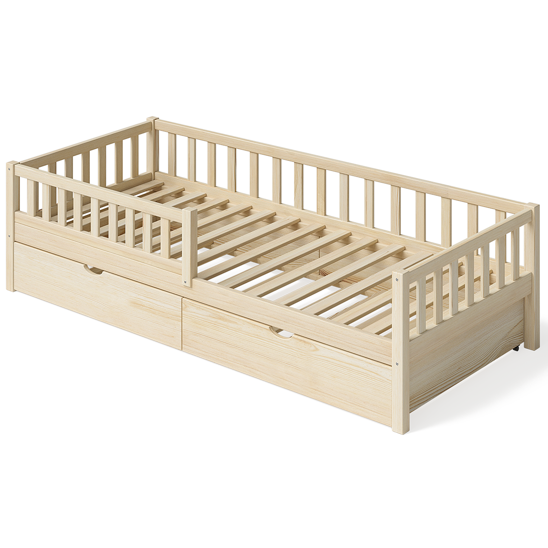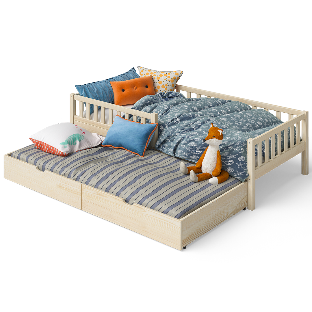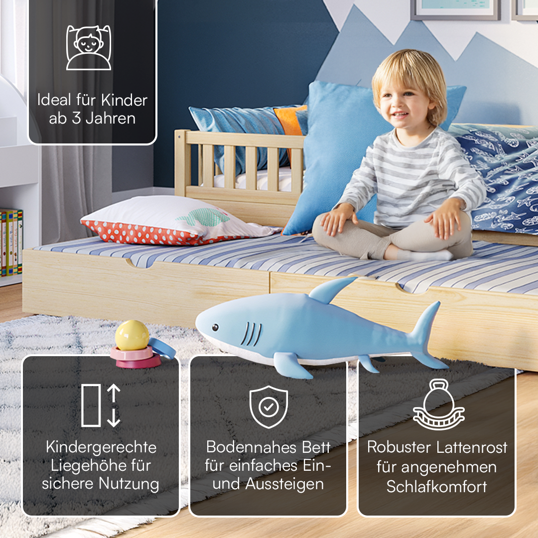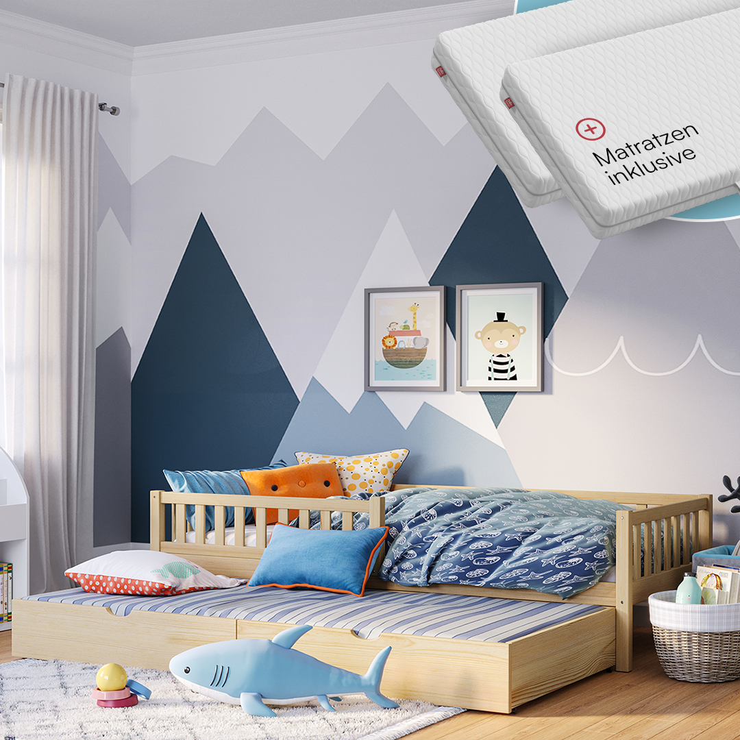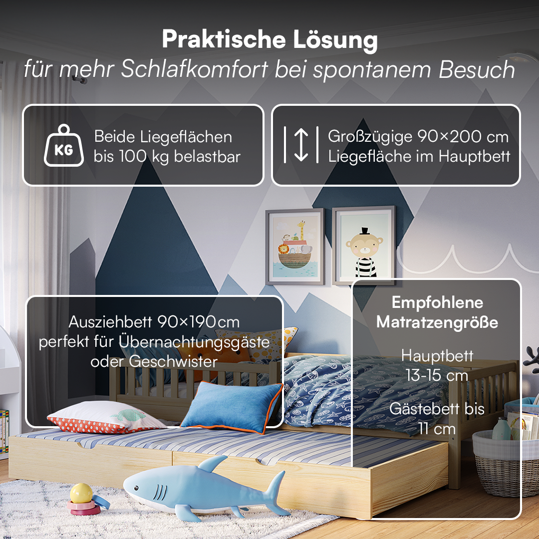 Vils Kinderbett 90x200 cm, Kiefer massiv, natur, inkl. Gästebett 90x190 cm und Rausfallschutz, mit 2 Matratzen