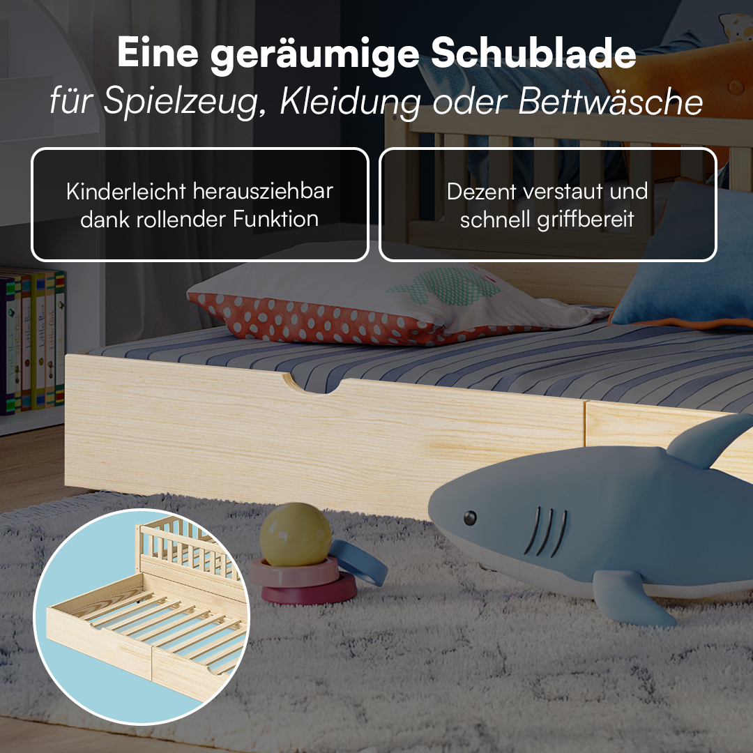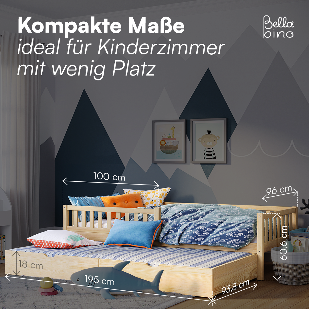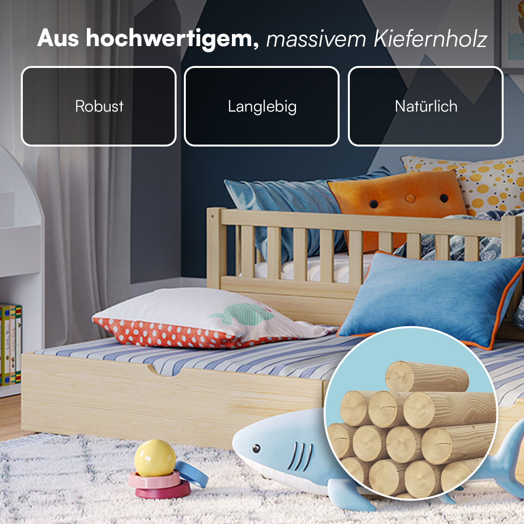 Das Kinderbett Vils von Bellabino vereint Komfort, Flexibilität und zeitloses Design. Aus massivem Kiefernholz gefertigt, bietet es eine Liegefläche von 90 x 200 cm und ein integriertes Gästebett (90 x 190 cm), das platzsparend verstaut werden kann.