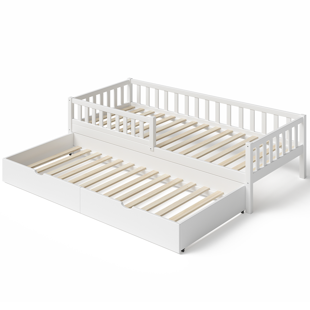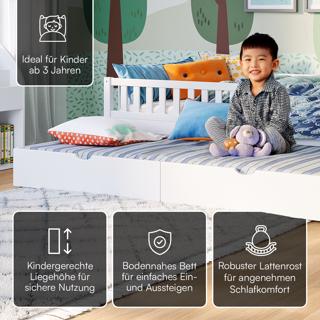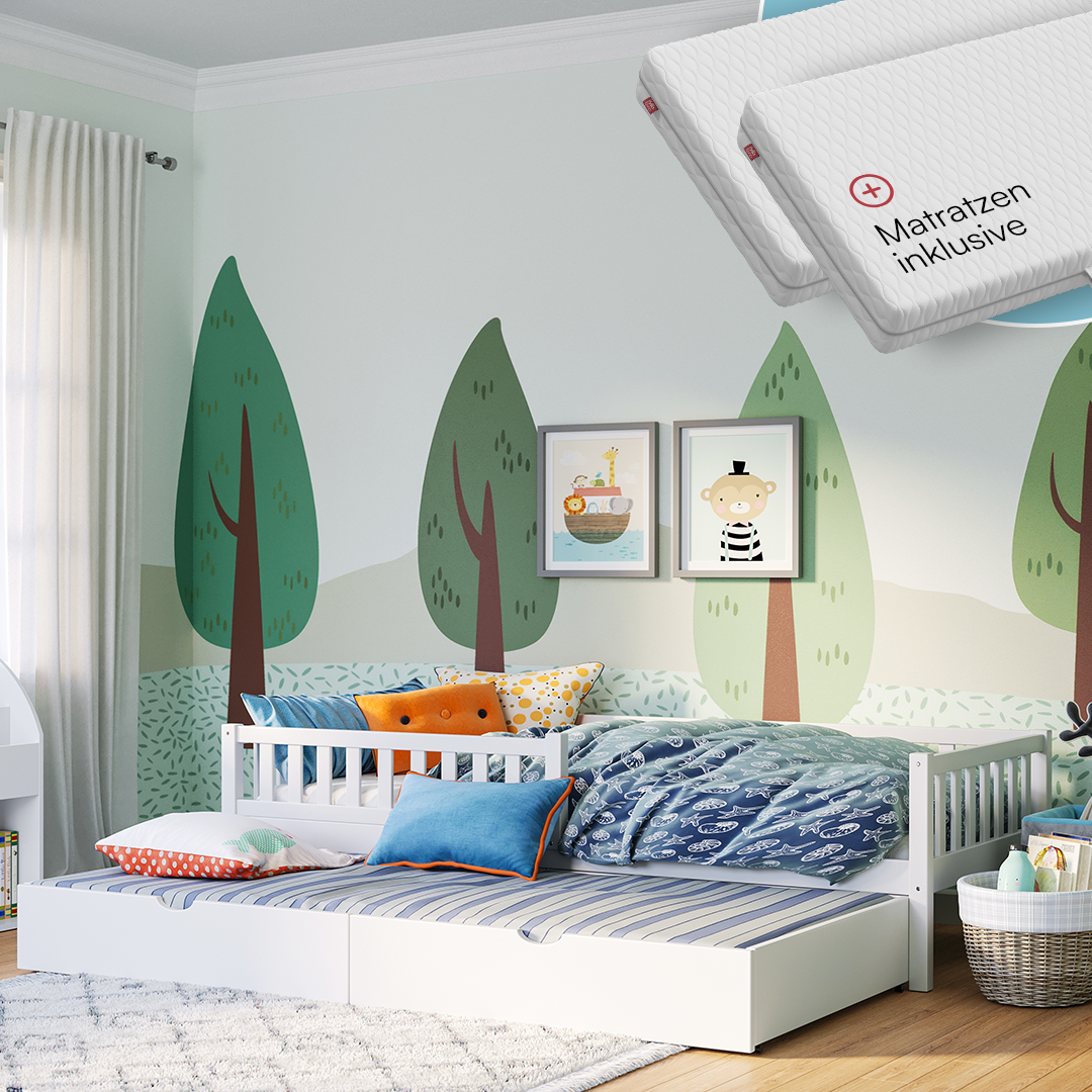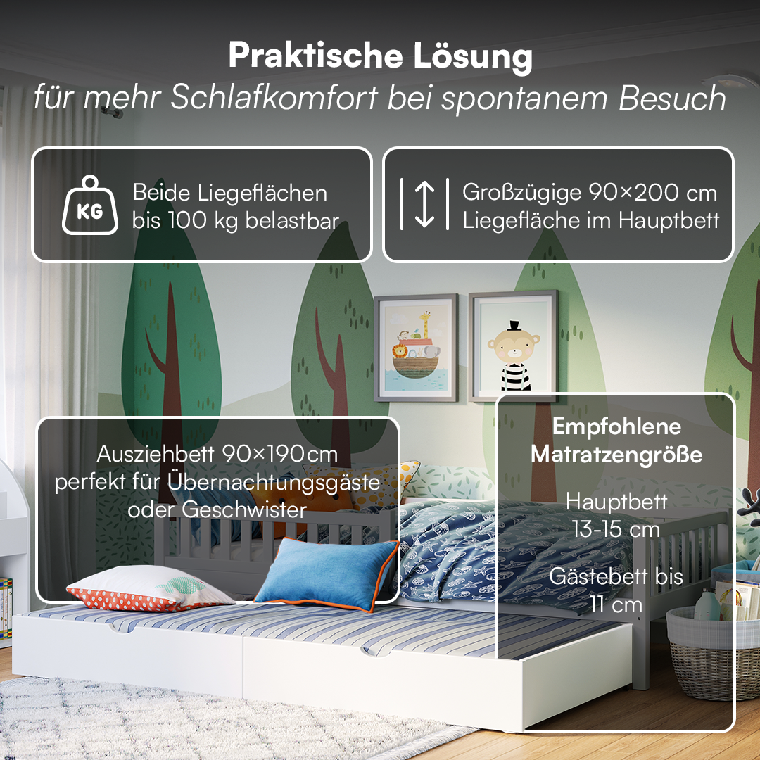 Vils Kinderbett 90x200 cm, Kiefer massiv, weiß lackiert, inkl. Gästebett 90x190 cm und Rausfallschutz, mit 2 Matratzen
