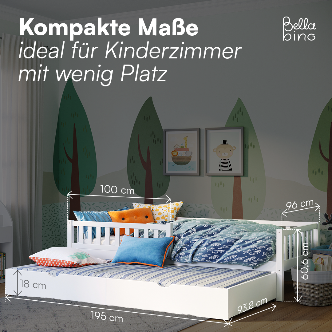 Entdecken Sie das vielseitige Kinderbett 'Vils' von Bellabino: Ein durchdachtes Möbelstück aus massivem Kiefernholz mit zeitlosem Design. Mit kompakten Maßen (H 60,6 cm, T 209,0 cm, B 96,8 cm) bietet es eine großzügige Liegefläche von 90x200 cm und ein praktisches Gästebett (90x190 cm), leicht verstaubar unter dem Hauptbett.