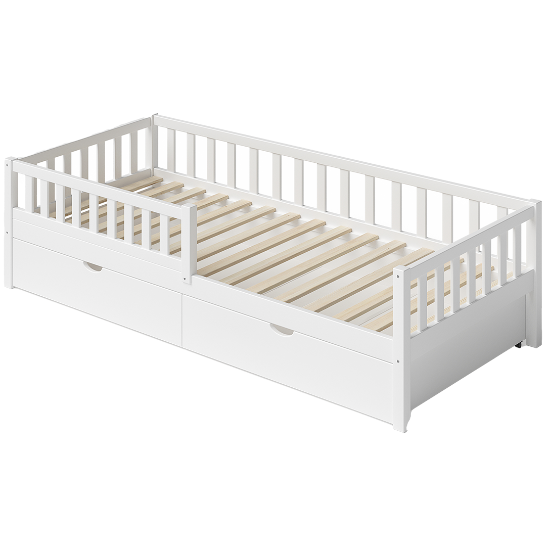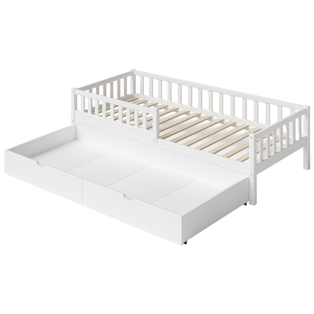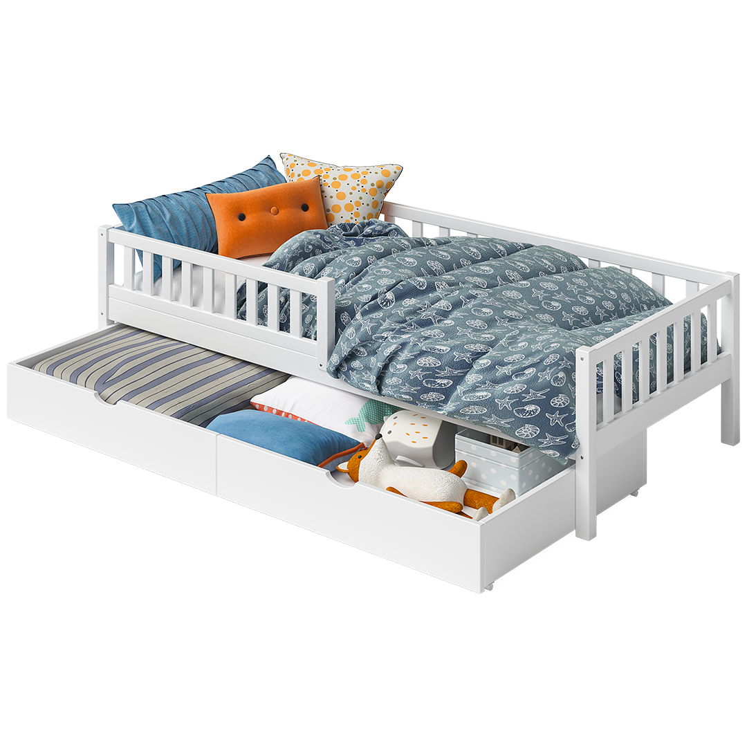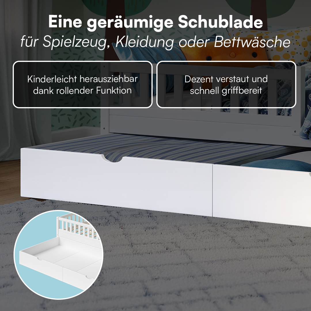 Ein beidseitig montierbarer Rausfallschutz sorgt für Sicherheit, lässt sich aber auch leicht entfernen, um das Bett an die Bedürfnisse wachsender Kinder anzupassen. Die integrierte Schublade auf Rollen schafft zusätzlichen Stauraum für Bettwäsche oder Spielzeug.